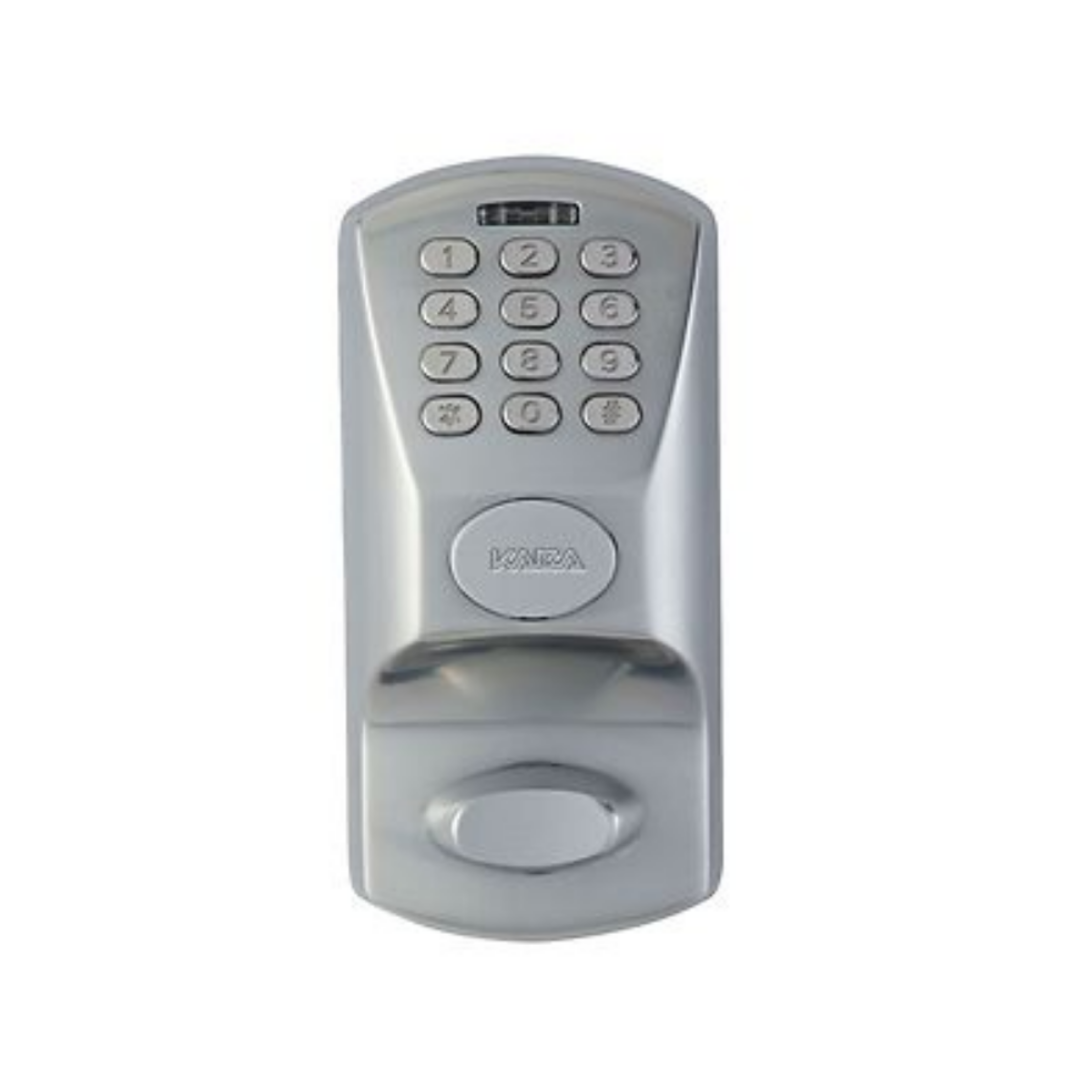 The E-Plex 1500 Series provides exterior access by PIN code, while allowing free egress. This small, sleek keyless electronic pushbutton deadbolt lock replaces existing deadbolt and eliminates problems and costs associated with issuing, controlling, and collecting keys and cards.